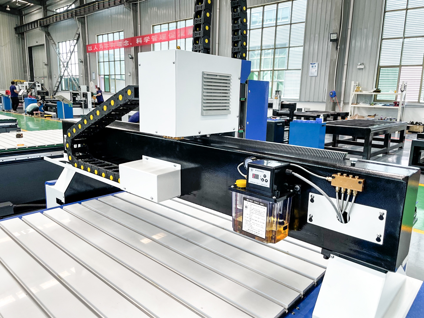 – Mesa de Trabajo con ranuras T para fijación del material con mordazas.
